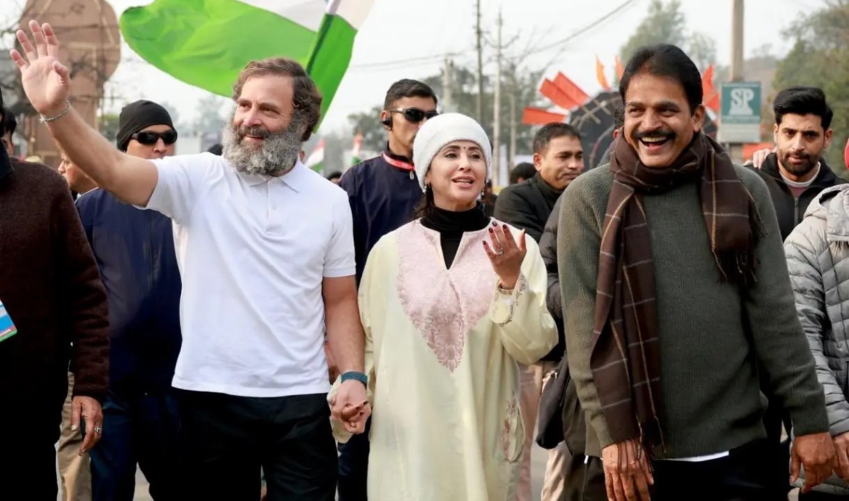 Ms Matondkar joined Rahul Gandhi shortly after the march started from near the army garrison around 8 am amid tight security, with Congress workers and supporters lined up on the road along the route to welcome them.