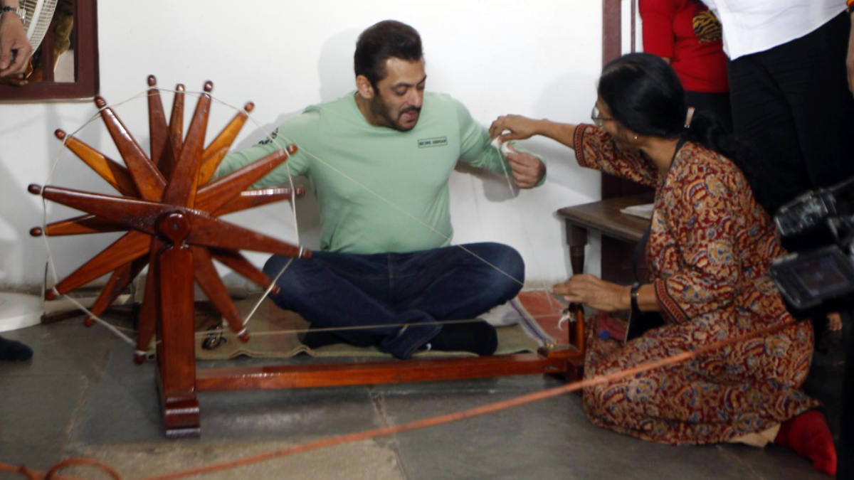 Photos of Salman Khan spinning Charkha at Sabarmati Ashram goes viral.